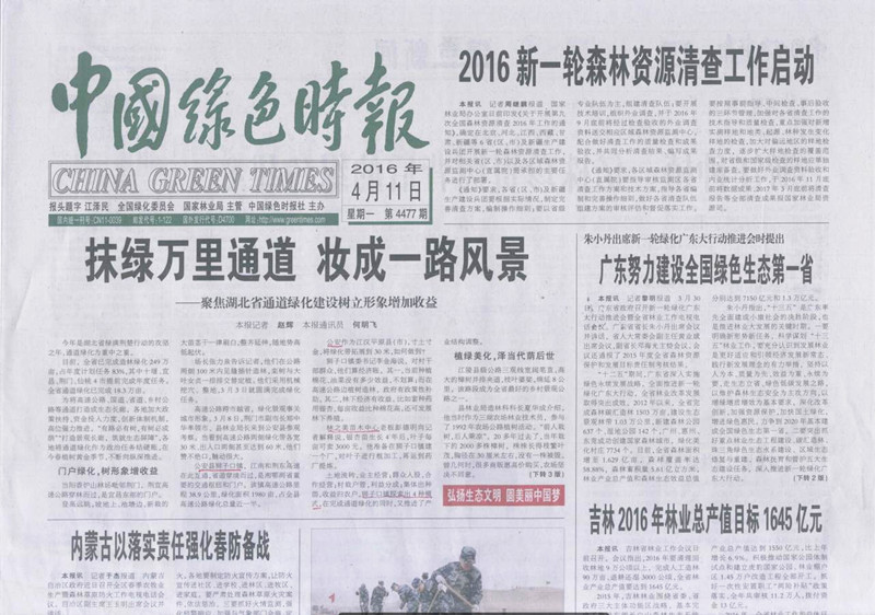 4月11日,中国绿色时报头版头条报道了公安县通道绿化建设情况,是对我县通道绿化建设工作的充分肯定,《中国绿色时报》是全国绿化委员会和国家林业局主办的我国唯一以"绿色"命名的国家级生态环境类社会性报纸。