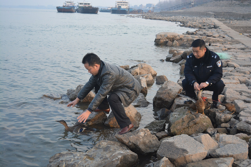 2015年1月4日,在公安县长江边,一群群鸟儿被"放飞"回到蓝天,一只只野鸭被解救放生长江滩涂,旨在保护野生动物的"猎鹰行动举报电话110联动"已初战告捷。