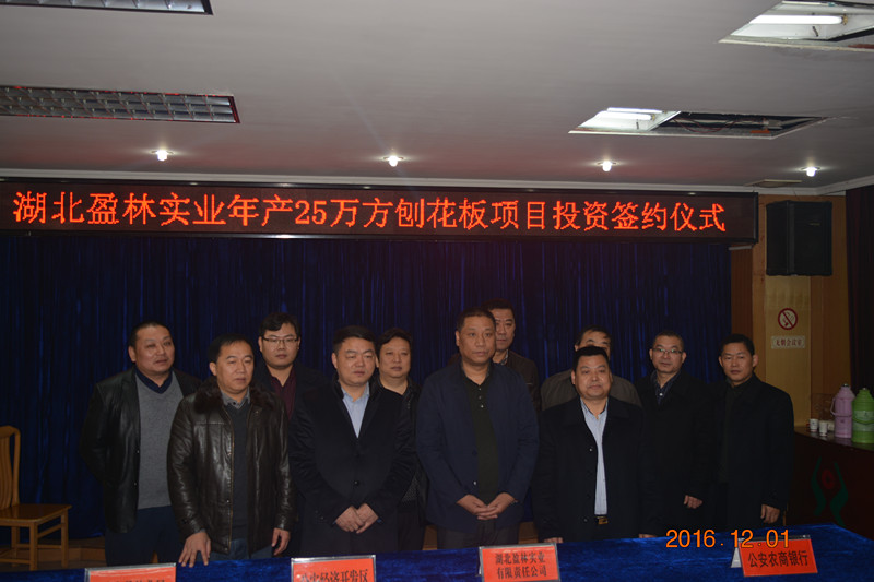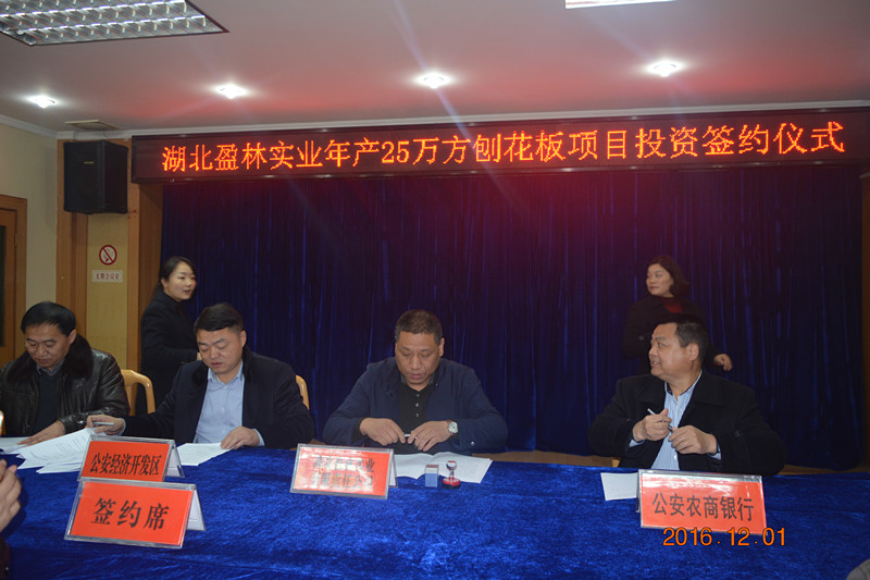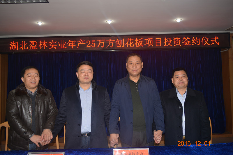 12月1日,县经济开发区管委会副主任袁誉祥、县林业局局长甘力、县农商银行朱远伦董事长、湖北盈林实业有限公司董事长裘定超在县农商银行会议室隆重举行了湖北盈林实业年产25万方刨花板项目投资签约仪式。